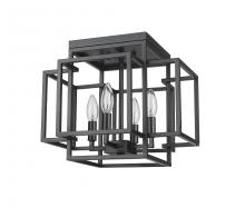Illuminate a contemporary interior with this Arts and Crafts architecture-inspired modern flush mount, featuring a dimensional wire frame cage that surrounds a candelabra style light fixture with exposed bulbs. With a striking silhouette brought on by the bold matte black finish steel cage, this modern four-light flush mount makes a beautiful minimalist style addition to foyers, dining rooms and so much more, elevating the space with its tesseract-like angles and spatial presence. Adorn this transitional flush mount with glowing Edison style bulbs for a wonderfully inviting glow and ambiance.
