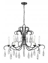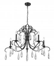 Sinuous scrolls and delicate crystal teardrops lend lush sophistication to a contemporary five-light chandelier. In matte black, it creates a rich, organic design element over an entry or in a dining room. Candelabra lights are a classic touch, offering a soft, warm glow for inviting ambiance.
