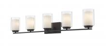 Give your powder room a chic, sophisticated update. This beautiful, matte black vanity light features five glowing bulbs beneath five delicate, glass shades that are matte opal on the inside and clear on the outside. An exquisite lighting option to highlight your refined sense of style.