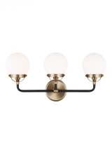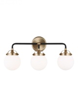 The Cafe three light vanity fixture in satin brass offers shadow-free lighting in your powder room, spa, or master bath room. Â Handsome two-tone finish and white glass globe shades.