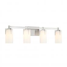 Bring fashionable, vintage-inspired lighting home with the Savoy House Caldwell 4-light bath bar. Etched white opal glass shades are held in place with dramatic jewelry-like prongs that are finished in Satin Nickel. Caldwell is 8.5" in height, 32" in width and extends 5.5" from the wall. It uses four candelabra size bulbs of up to 60 watts per bulb. Bulbs not included. This bath light is damp area rated and must be installed as shown.