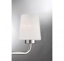 Add chic style to any bathroom with the Savoy House Capra 3-light bath bar. Its substantial structure features classic details along with white opal glass shades that are tapered like lamp shades and open at the top to give off a flattering glow. The large oval-shaped backplate helps to cover up any holes left behind from replacing old bath bars, too. Plus, the hardware for this fixture has been thoughtfully moved to the side of the backplate, allowing for a crisp and clean look. Finished in polished nickel. This fixture is 22" wide and 9" tall. It extends 6.5" from the wall. Uses 3 standard size bulbs of up to 60 watts each (not included).