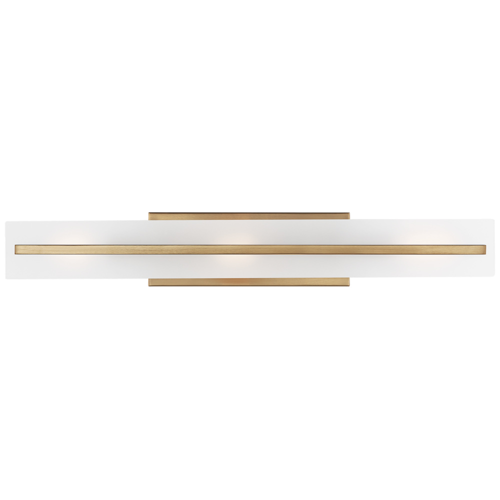 The Dex three light vanity fixture in Satin Brass is a contemporary design with three finishes and white acrylic diffuser creating a crisp look and bright clean ambiance. With the clean lines and classic styling, the Dex vanity series is versatile enough to be used in any transitional setting.
