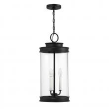 Classic lantern style gets a fresh new look in the Savoy House Englewood 3-light outdoor hanging light. A beautiful cylinder of clear glass is held in a minimally detailed frame finished in timeless Matte Black. White candle covers create a perfect pairing with the finish. Englewood is 23.5" in height and 10.5" in width. Uses three candelabra size bulbs of up to 40 watts per bulb. Bulbs not included. Damp area rated.