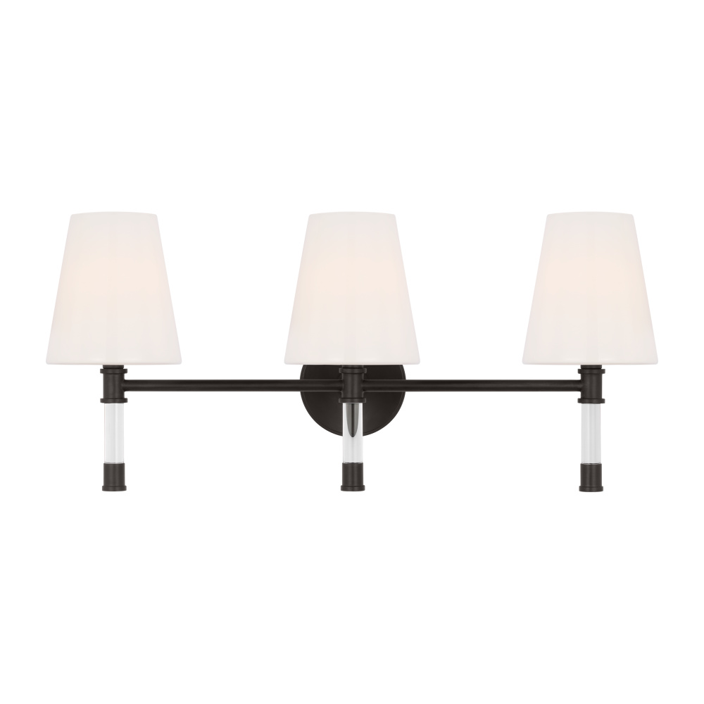 In the Hanover three-light wall vanity, Lucite arms form an elegant, dynamic silhouette that stems from a hub of either Burnished Brass and Polished Nickel finish and extends to matching color candle tubes, topped with exposed candelabra bulbs. Round backplate.