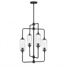 The Savoy House Holton 4-light foyer light showcases an inventive and geometric style with tall, rounded shades of clear ribbed glass and a slim, rounded structure finished in Matte Black. It will bring a big dose of style to any space! Holton is 20" in width and has an adjustable height ranging from 28.25" to 82.25". It uses four standard size bulbs of up to 60 watts per bulb. Bulbs not included. Comes with four 12" downrods and one 6" downrod.