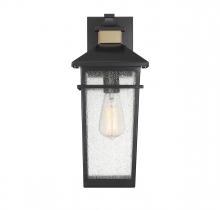 This Savoy House Kingsley 1-light outdoor wall light has a coastal-inspired lantern style with highly fashionable touches. Panes of seedy glass are accentuated by a matte black finish with brass detailing at the backplate and hood. Kingsley is 16.25" in height, 7" in width and extends 8.25" from the wall. It uses 1 standard size bulb with a max of 60 watts (bulb not included).