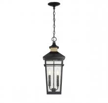 This Savoy House Kingsley 2-light outdoor hanging light has a coastal-inspired lantern style with highly fashionable touches. Panes of seedy glass are accentuated by a matte black finish with brass detailing at the hood. Kingsley is 22.5" in height and 8.5" in width. It uses 2 candelabra size bulbs of up to 40 watts per bulb (bulbs not included).