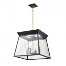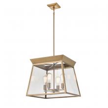The Lucian collection, designed by Kevin Kraemer, is a modern twist on a classical lantern style light. Shown in a rich plated brushed brass (also available in black with brass accents). Clear panel glassware surrounding the bulbs. The model shown is a 4 light flushmount. Great for any area of the home.