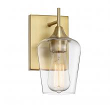 The Octave 1-light sconce from Savoy House has understated elegance. It features a large curved shade of clear glass, minimal detailing and a warm brass finish. It may be mounted as either uplight or downlight. Sconces add a touch of style and light to any wall, including but certainly not limited to hallways, entryways, stairways, great rooms and dining rooms. You will also often see a pair of sconces flanking a bathroom vanity mirror to provide an even, flattering wash of light. Because the bulb is exposed, try using a stylized bulb (not included) such as Edison for a different look! The warm brass finish can be paired with brass hardware or mixed with hardware in other fixtures. Try the Octave with glam, transitional or contemporary style rooms for a chic look. When you choose a Savoy House lighting fixture, you can be certain you've selected a piece that will withstand the test of time.