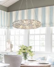 The Palla Ring chandelier is fitted with different sized round, hand-pinned, organic, and naturally textured Capiz shells, creating a unique texture and sparkle that play with the interplay of light and shadow. Faceted cut crystal jewels nestled within overlapping metal circles offer depth and dimension, elevating the chandelier into a work of art. Its open-ring design at the top directs light upward, creating a warm and inviting ambiance, and casts a gentle, downward glow. The same enchanting Capiz shells and crystal details that grace the fixture are mirrored on the canopy, ensuring that every aspect of the Palla Ring Chandelier exudes a sense of organic luxury and sophistication.