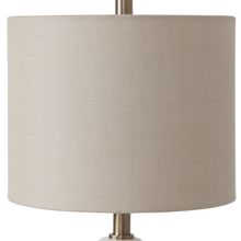 This Buffet Lamp Features A Delicate Design with Traditional Elements That Showcase Polished White Marble Details, Paired with Antique Brass Plated Accents. The Round Hardback Shade is A Warm Khaki Linen Fabric.