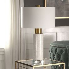 This Solid Concrete Column Base Features A Polished Surface Finished in A Bleached Wash, Accented with A Thick Crystal Foot, and Brushed Brass Plated Details. The Round Hardback Drum Shade is A White Linen Fabric.