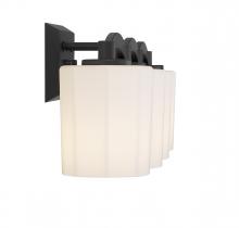 Get understated glamour for the bathroom with this Savoy House Whitney 4-light bath vanity light. Fluted shades of opal etched glass offer up a flattering glow, the curving arm adds intrigue and the matte black finish adds versatility. Whitney is 8" in height, 33" in width and extends 6.5" from the wall. It uses four standard size bulbs of up to 60 watts per bulb (bulbs not included).