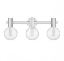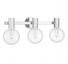 This Savoy House Wright 3-light bath vanity light showcases streamlined style that makes it ideal for any bathroom. Round clear glass shades add an extra dimension and extra protection for the light bulbs within. Chrome finish. Wright is 25" in width, 10" in height and extends 7.5" from the wall. Uses 3 standard size bulbs of up to 60 watts per bulb (bulbs not included). We recommend using tubular shaped bulbs.